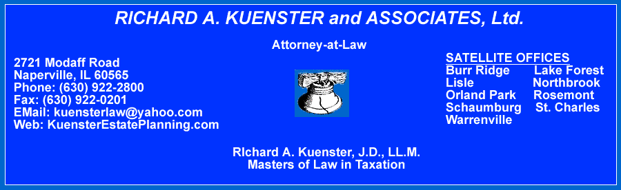 Richard A. Kuenster is a tax and trust attorney and financial planning consultant, concentrating in tax, trust planning, business, estate planning and financial consulting for over 35 years. He received his B.A. from the University of Notre Dame (1973). His law degree (J.D. 1978) and his master's degree in tax law (LL.M. 1982) from The John Marshall Law School. He has been quoted in the following newspapers: Wall Street Journal, Chicago Tribune, Chicago Sun-Times, and USA Today. He has done extensive speaking in his area of expertise to attorneys, accountants and other professionals.